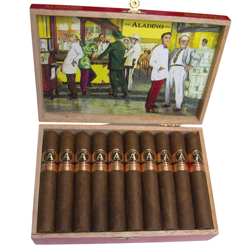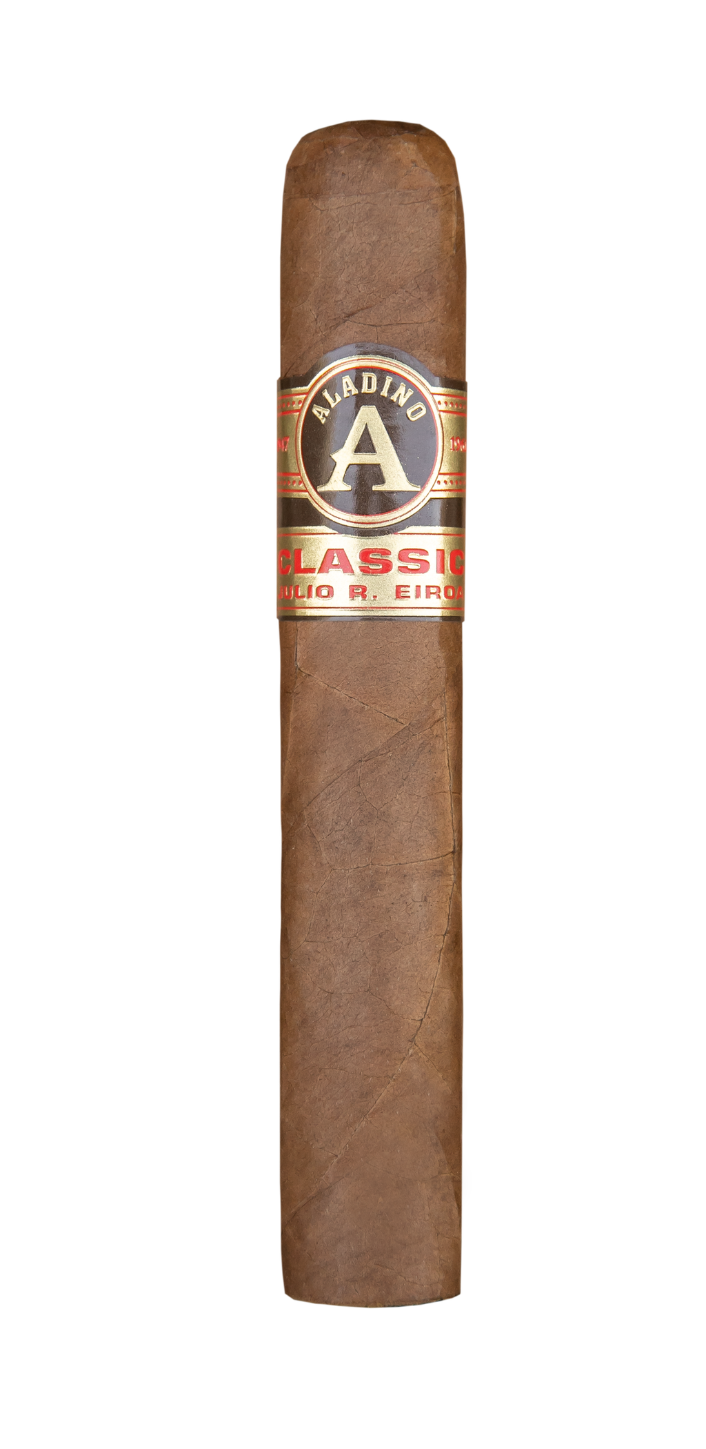 The Aladino Classic Robusto is a medium-bodied Honduran puro cigar, crafted with a Habano wrapper and a Corojo binder, featuring filler also made from Habano and Corojo leaves. This exceptional smoke, produced by the renowned Aladino portfolio, offers a smooth, rich, and complex smoking experience that deviates from the typical lineup. Known for its excellent construction, burn, and balance, it develops flavors of wood, hay, earth, and baking spices, evolving into notes of nuts, cream, and honey. The cigar starts with a woody, earthy profile accented by hints of straw, progressing to include cinnamon, cedar, and a subtle sweetness that may evolve into caramel or honey. The retrohale may reveal hints of pepper, cream, and baking spices. Renowned for its impeccable construction, it delivers an even burn and solid ash. Generally considered medium-bodied, it provides a pleasant smoking experience without being overpowering. The Aladino Classic Robusto is praised for its complexity, balance, and nostalgic feel, harking back to the classic Cuban cigars of the mid-20th century. All tobacco is grown in Honduras, making it a true puro that embodies tradition and craftsmanship.