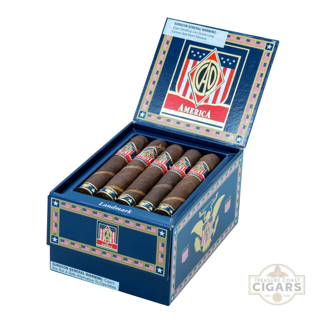 Celebrate American pride with the CAO America Landmark, a bold 6 x 60 cigar that honors the spirit of the red, white, and blue. Available at Treasure Coast Cigars, the Landmark is a hefty, slow-burning tribute to American craftsmanship, strength, and freedom. It features a stunning barber pole wrapper made from alternating Connecticut Broadleaf and Connecticut Shade leaves, delivering a striking appearance and complex flavor. Inside, a blend of U.S.-grown tobaccos from Pennsylvania and Kentucky combines with rich Nicaraguan fillers to create a medium-to-full-bodied profile with notes of oak, leather, pepper, and a hint of natural sweetness. The Landmark’s larger ring gauge offers a cooler, longer-lasting smoke that’s perfect for patriotic celebrations or relaxing with pride. More than just a cigar, the CAO America Landmark is a tribute to hard work, independence, and bold flavor. Light up and enjoy the taste of true American tradition.