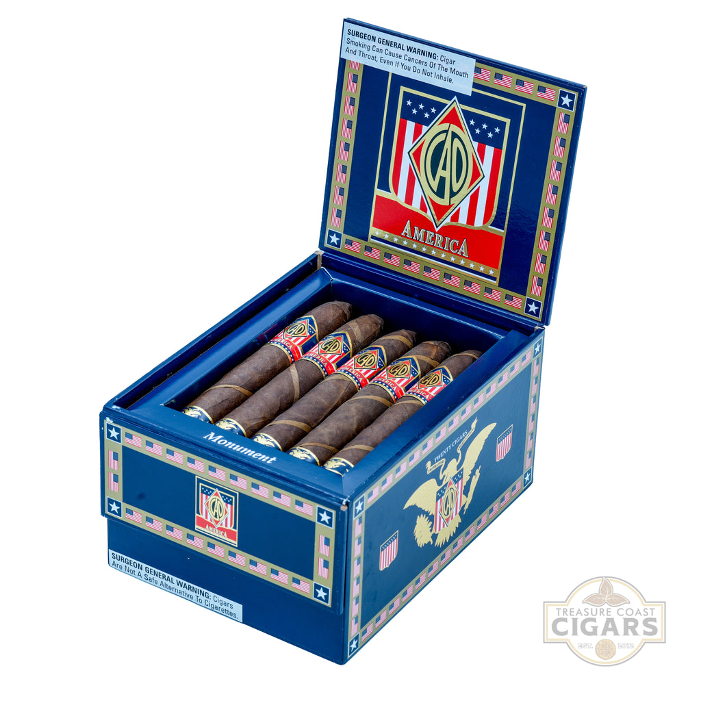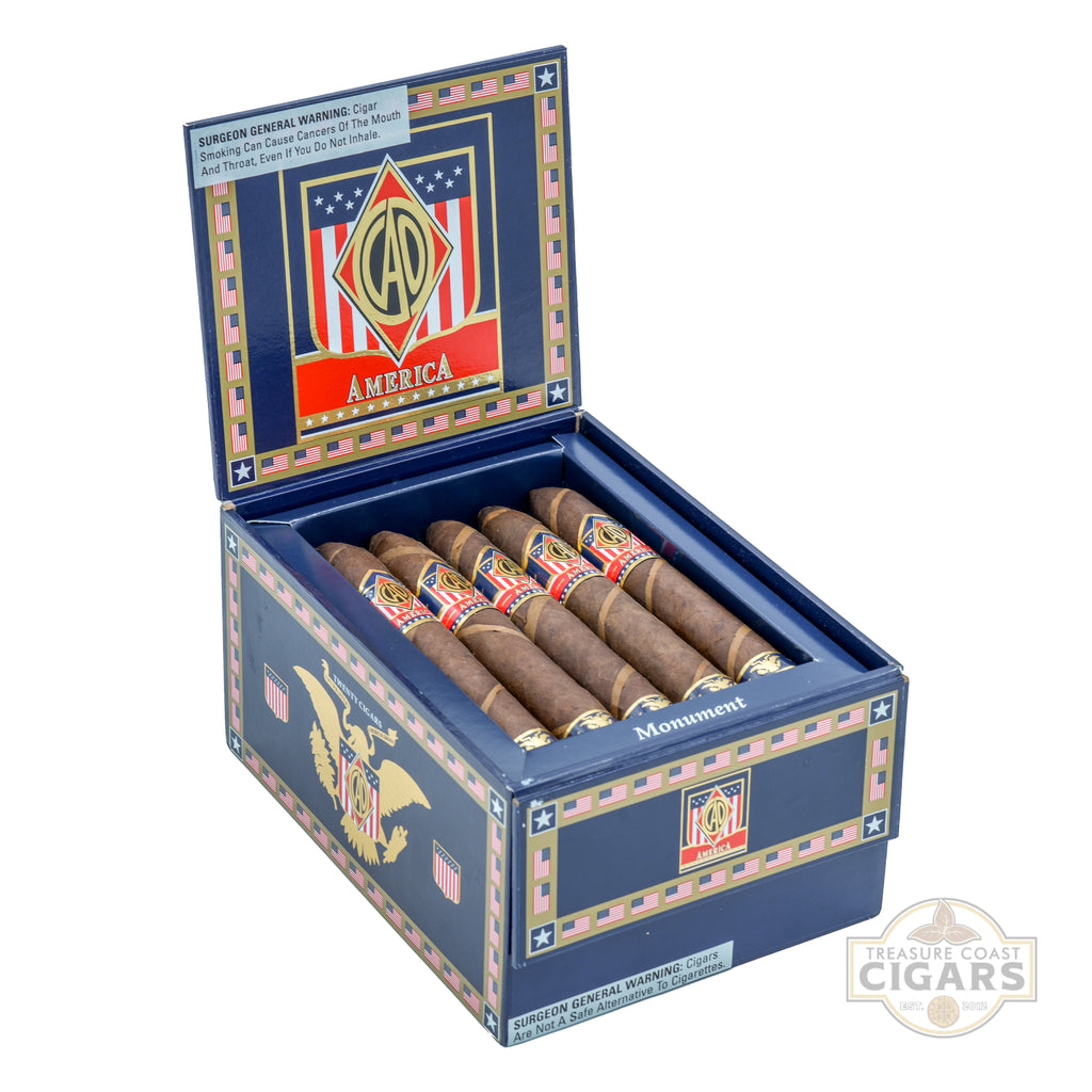 Celebrate American pride with the CAO America Monument, a bold cigar that pays tribute to the red, white, and blue. Available at Treasure Coast Cigars, this 6 1/4 x 54 powerhouse is a symbol of craftsmanship, strength, and freedom. Featuring a striking barber pole wrapper of Connecticut Broadleaf and Connecticut Shade, the Monument delivers a truly unique visual and smoking experience. Inside, a robust blend of U.S. grown tobaccos from Pennsylvania and Kentucky is paired with Nicaraguan fillers, creating a medium-to-full-bodied profile with rich notes of oak, leather, spice, and a touch of sweetness. The CAO America is more than a cigar, it's a salute to the hardworking spirit that built this country. From backyard BBQs to fireworks under the stars, it’s the perfect companion for patriotic moments. Light one up and taste the bold flavor of freedom.