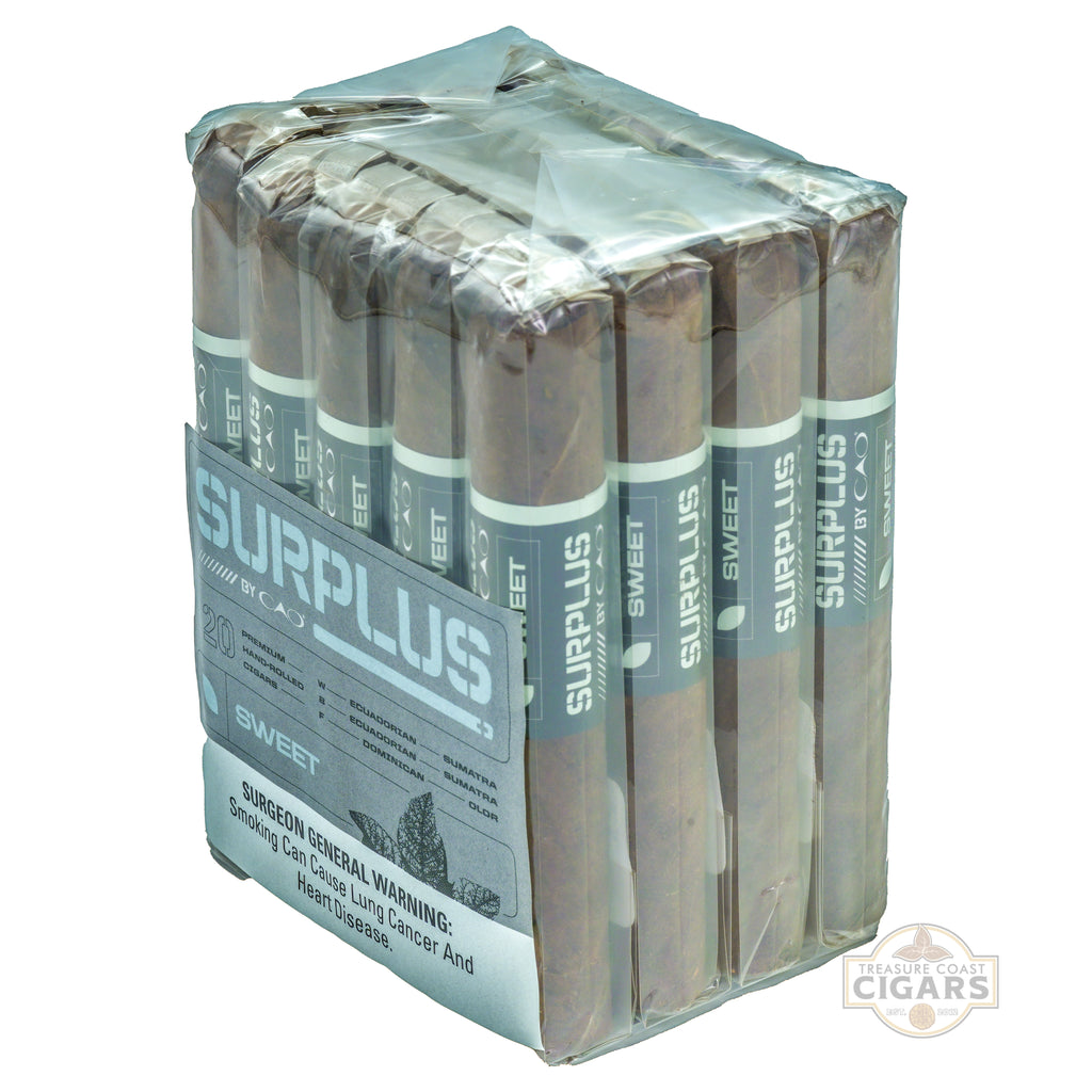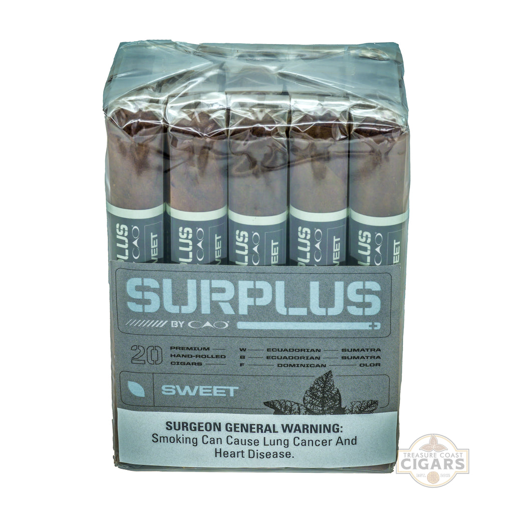 The CAO Surplus Sweet Robusto is a smooth, flavorful cigar that delivers a highly enjoyable experience at an exceptional value. Sized at 5 x 50, it features a beautiful Ecuadorian Sumatra wrapper that imparts a touch of spice and natural earthiness. Inside, a blend of Dominican fillers provides a mellow, creamy foundation with subtle notes of cedar and toasted nuts. The sweetened cap enhances the overall profile, adding a gentle honey-like sweetness that perfectly balances the wrapper’s spice. From the first draw, expect a mild-to-medium body that gradually develops richer nuances of cocoa and soft wood while remaining approachable and smooth. The construction is solid, with an even burn and consistent draw that makes it easy to enjoy from start to finish. Ideal for those who appreciate cigars with a touch of sweetness, the CAO Surplus Sweet Robusto is a satisfying everyday smoke that combines balance, flavor, and affordability.
