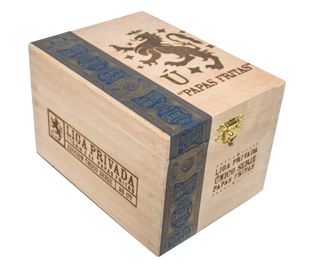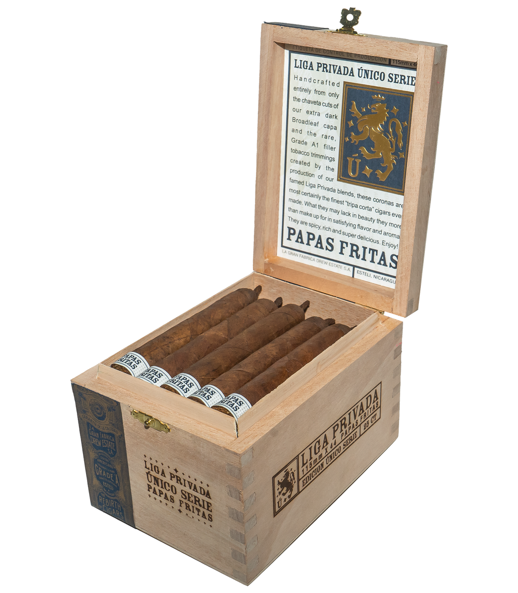 Discover the bold artistry of Liga Privada Unico Serie Papas Fritas cigars, a standout from Drew Estate, celebrated for redefining premium cigars. Hand-rolled in a compact 4.5 x 43 size with a distinctive pigtail cap, these full-bodied cigars blend long fillers from m Honduras and three unique Cuban-seed Nicaraguan tobaccos. Wrapped in a Connecticut Broadleaf with a zesty Brazilian Mata Fina binder, Papas Fritas delivers a robust flavor profile of licorice, black pepper, herbal notes, and sweet spice. Perfect for those seeking an intense, unforgettable smoke, add a box of these masterfully crafted quick smokes to your collection at Treasure Coast Cigars today.