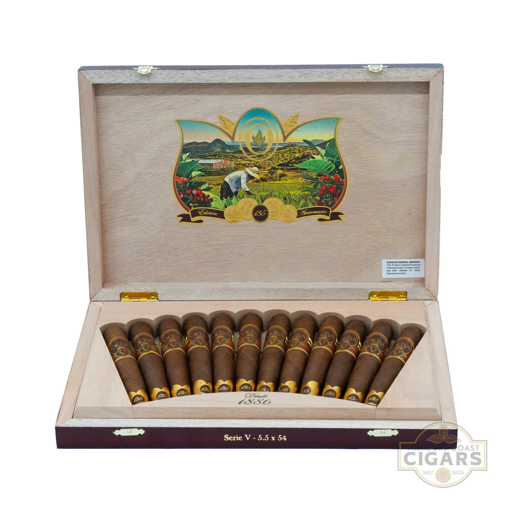 Celebrate 135 years of cigar-making excellence with the Oliva Serie V 135th Anniversary Edicion Limitada, a masterful 5.5 x 54 Perfecto handcrafted in Nicaragua. This limited-edition cigar consists of a light-brown Ecuadorian habano seed wrapper encasing a bold Nicaraguan binder and well-aged Ligero long-fillers. Delivering a medium-strength, full-bodied smoke, it captivates with rich coffee, cocoa, and nutty notes, accented by tangy cayenne, wood, and black pepper. A light floral aroma and hearty, earthy finish. Perfect for fans of the 95-rated Oliva Serie V, this meticulously rolled cigar, with its chunky head and tapered foot, offers a substantial profile that culminates in perfect accord. Available at Treasure Coast Cigars, this celebratory smoke is a must-have for enthusiasts seeking premium craftsmanship and unforgettable flavor.