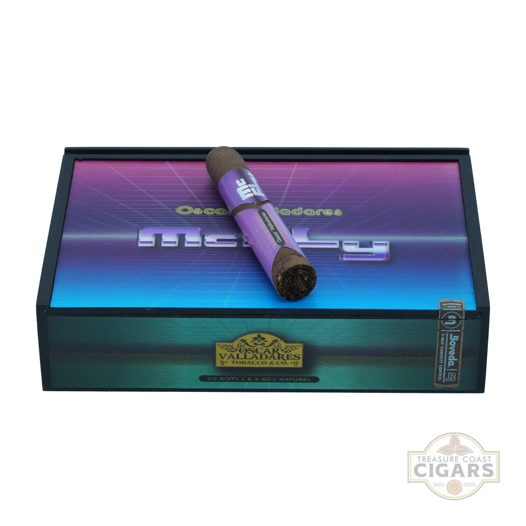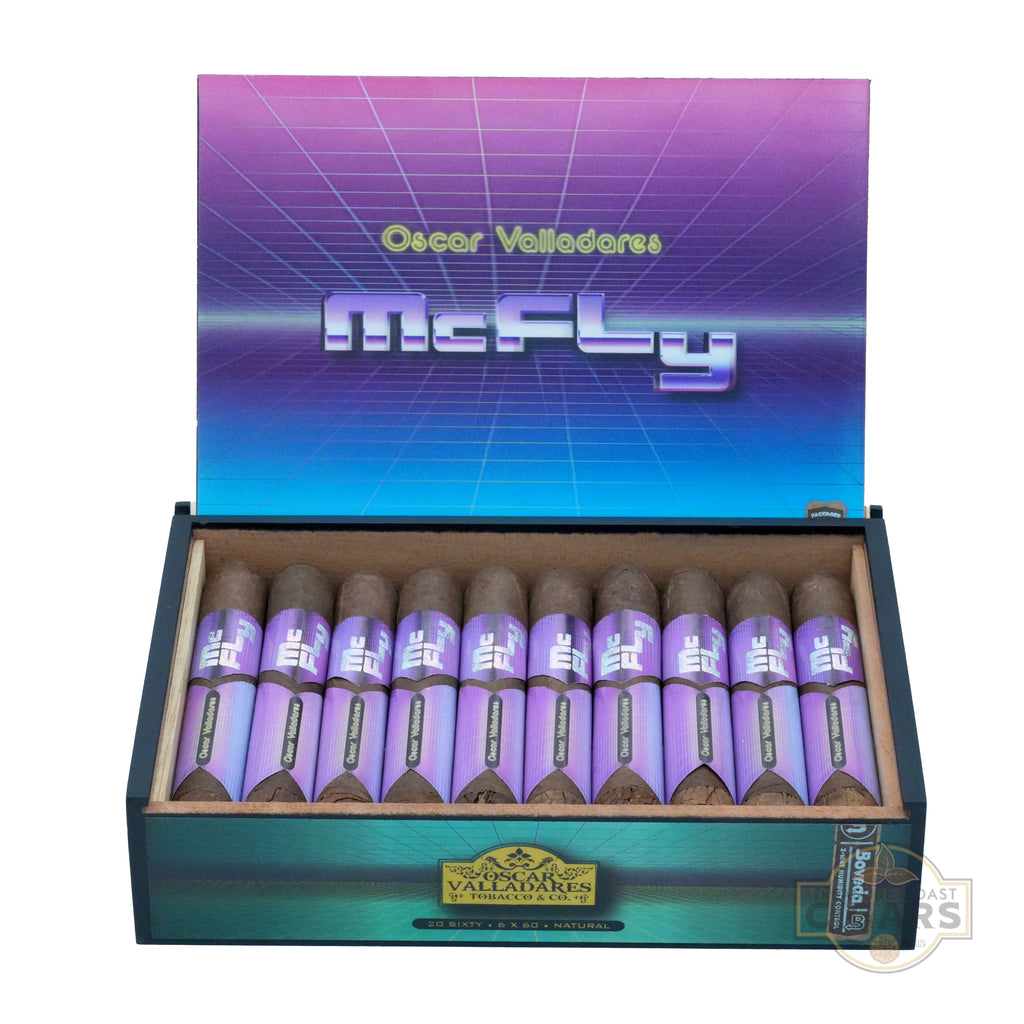 The Oscar Valladares McFly cigar, inspired by the 1985 film "Back to the Future," is a medium-bodied smoke with a medium-full strength finish. Handmade in Honduras, it features a dark, oily Mexican San Andrés wrapper, a Honduran binder, and premium long-filler tobaccos from Honduras, Nicaragua, and the Dominican Republic. McFly has a complex flavor profile, transitioning from initial spice, wood, and white pepper to sweeter graham cracker notes with hints of baking spices, cedar, leather, earth, roasted nuts, and citrus zest. The exposed foot allows the filler leaves’ flavors to shine before blending with the wrapper’s sweetness and spice. Packaged in vibrant, holographic boxes of 20, this follow-up to the popular Super Fly line offers a bold, intriguing blend. Snag a box from us today to enjoy one of the most captivating cigars in the Oscar Valladares portfolio.