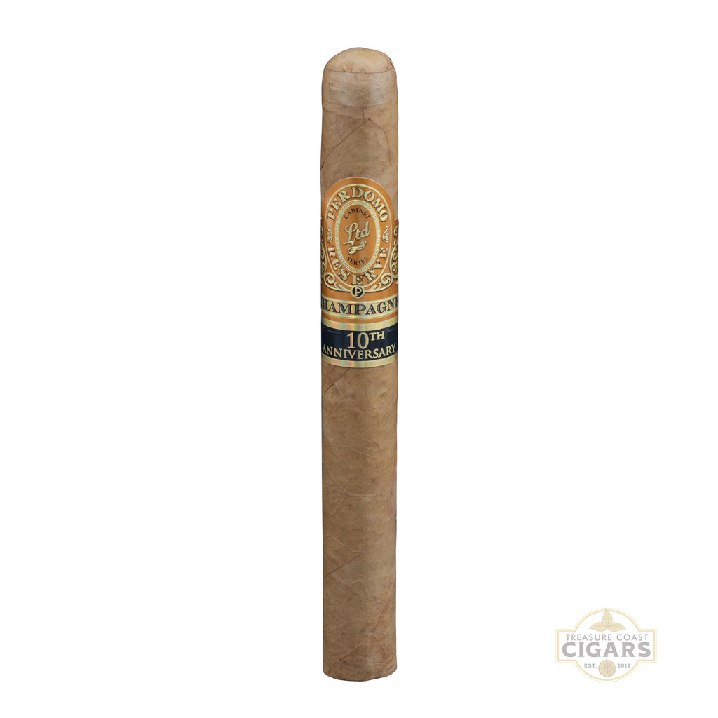 The Perdomo 10th Anniversary Champagne Churchill is an elegant 7 x 54 cigar that perfectly captures the smooth, refined essence of the Champagne line. Handcrafted with a silky, six-year-aged Ecuadorian Connecticut wrapper, this Churchill delivers a creamy and mellow profile while maintaining a depth of flavor that appeals to both seasoned smokers and newcomers alike. Beneath the golden wrapper lies a blend of rich Nicaraguan binder and fillers from Estelí, Condega, and Jalapa, offering remarkable balance and complexity. With each draw, notes of cedar, almonds, and a subtle honey-like sweetness unfold, complemented by hints of vanilla and toasted bread. The Churchill size provides an extended smoking time, allowing the nuances of flavor to develop slowly and luxuriously. Known for its impeccable construction, smooth draw, and even burn, the Perdomo 10th Anniversary Champagne Churchill, available at Treasure Coast Cigars, is the ideal cigar for those who appreciate elegance, consistency, and a long, rewarding experience.