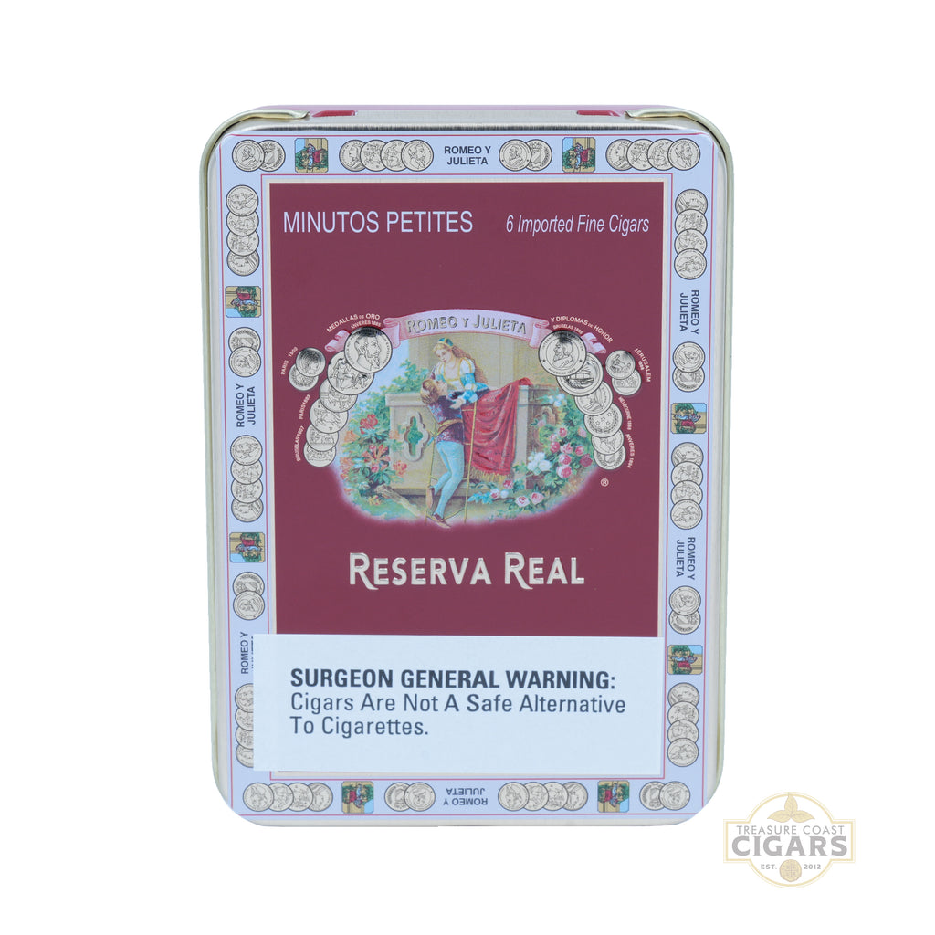 Romeo y Julieta Reserva Real Minutos Petites capture the rich character of the renowned Reserva Real line in a small, elegant format. Measuring 4 x 33, these premium mini cigars are hand-rolled with the same attention to detail as their larger counterparts. A silky Ecuadorian Connecticut Shade wrapper is paired with a Nicaraguan binder and a blend of Dominican and Nicaraguan long-fillers, resulting in a mild-to-medium-bodied profile that’s smooth, refined, and flavorful. Each puff delivers notes of cream, cedar, toasted nuts, and a hint of spice, balanced by a touch of natural sweetness. Perfect for on-the-go enjoyment, the Minutos Petites are packaged in sleek tins, offering convenience without sacrificing quality. Whether for a quick break, an evening out, or moments when time is limited, these small-format cigars deliver the sophistication and consistency Romeo y Julieta is known for. Available at Treasure Coast Cigars, Reserva Real Minutos Petites make every short smoke memorable.