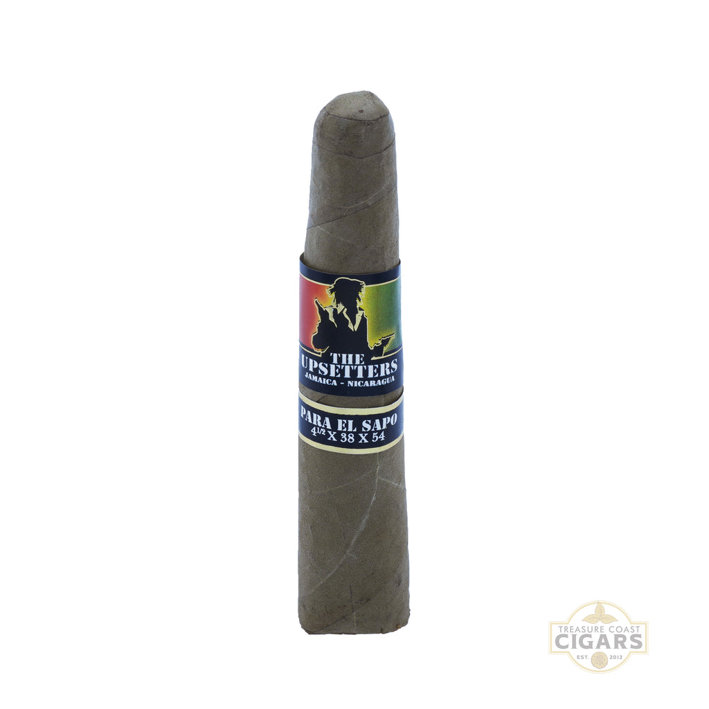 The Upsetters Para El Sapo is a beautifully crafted 4 1/2 x 54 figurado that immediately stands out with its rare Candela wrapper. Available at Treasure Coast Cigars, this distinctive cigar pairs Foundation Cigar Company’s signature Jamaican Cow Tongue tobacco with expertly aged Nicaraguan fillers, creating a one-of-a-kind smoking experience. The vibrant green Candela leaf imparts natural sweetness and fresh herbal notes, balanced by creamy undertones and subtle hints of tea. As the smoke develops, the unique character of the Jamaican leaf shines through, adding floral accents, spice, and a touch of earthiness that harmonize perfectly with the Nicaraguan core. Medium-bodied and incredibly smooth, Para El Sapo offers a flavorful yet approachable profile that will intrigue both seasoned aficionados and adventurous newcomers alike. Translating to “For the Toad,” this cigar captures the playful, rebellious essence of The Upsetters line while honoring the cultural rhythm and individuality that inspire it.